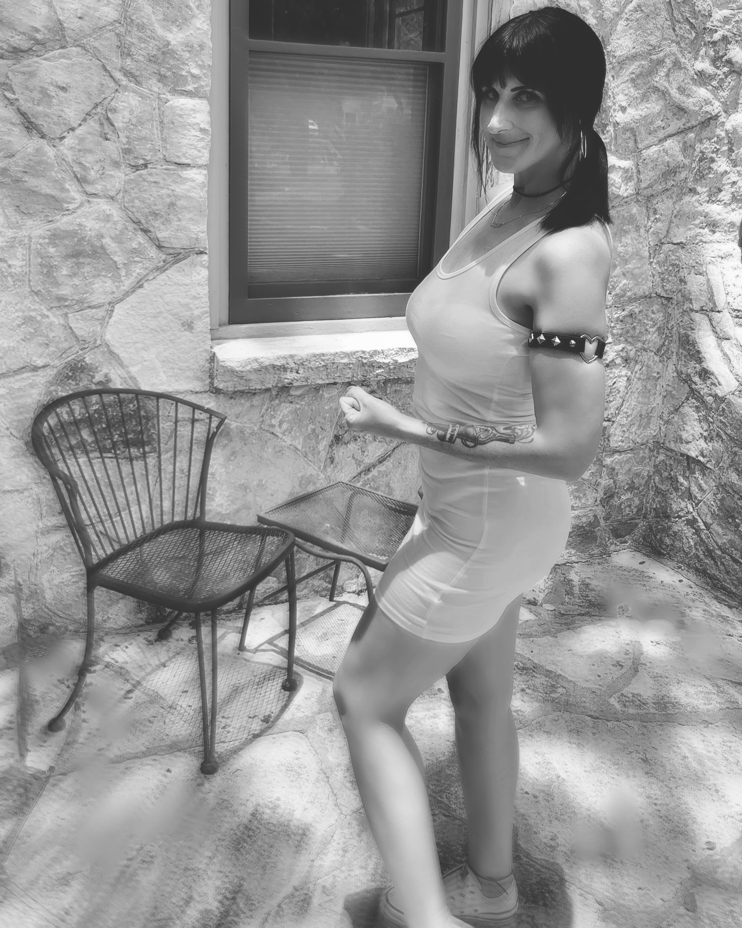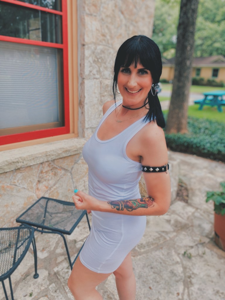 Once I saw Bohemian Rhapsody, I started thinking about how easy and fun this would be to recreate. Today, I strutted around town feeling like the Queen front man in my own version of his Live Aid ensemble. I already had the white tank dress and tennis shoes. Then I used a studded leather choker that happened to fit on my arm to finish off the look. I think I paid $6.99 for the choker at an accessory shop in the mall.